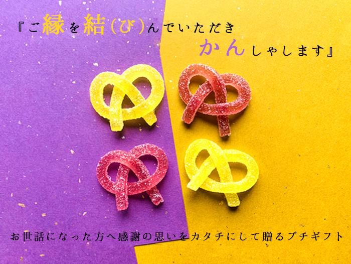 縁起の良い金と紫のぜりぃを、縁結びにちなんでひとつひとつ結いました。